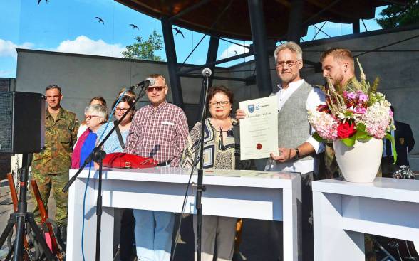 Der Zweibrücker Lebenshilfe-Vorsitzend Fred Konrad (2. von rechts) mit der Urkunde zur Patenschaft mit derBundeswehr, für die sich CDU-Verteidigungsexpertin Anita